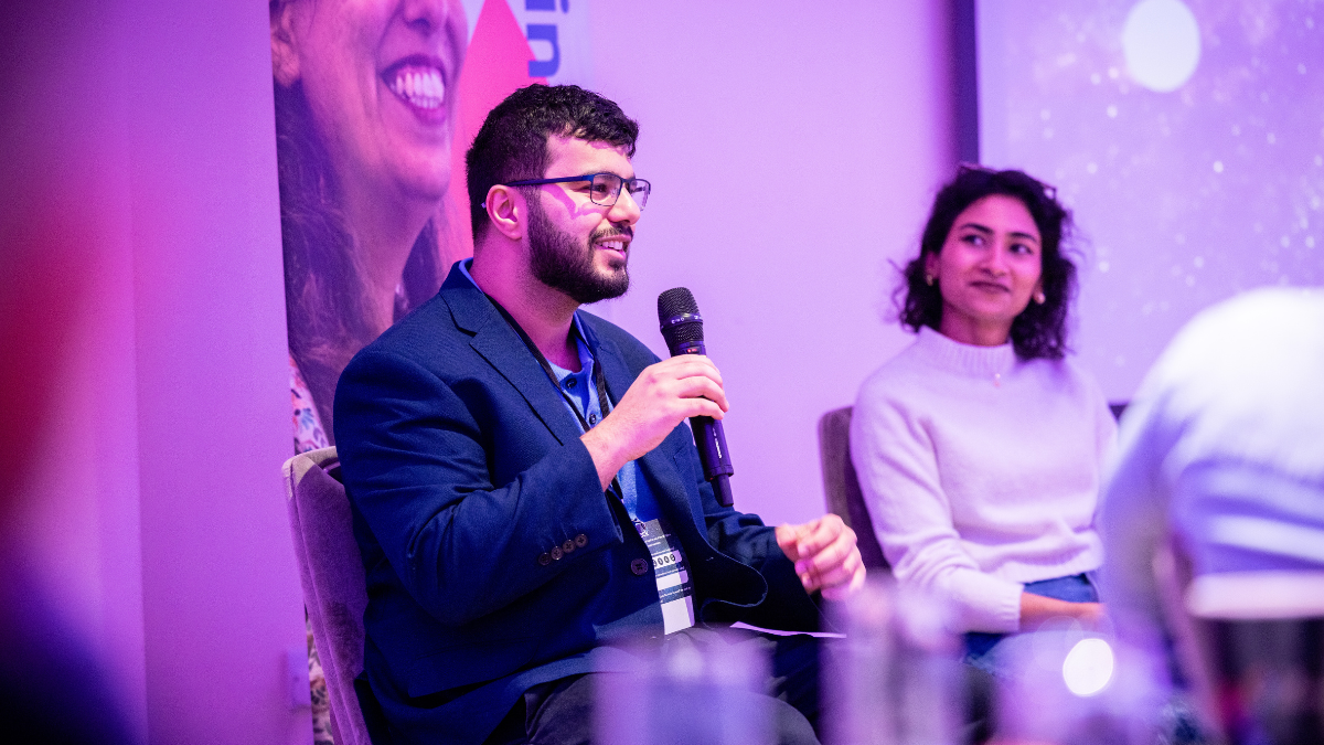 Group of people sitting at a table, engaged in conversation, at a conference or event. Behind them is a screen displaying the word 'TRAJECTORY' with a space-themed background and logos.